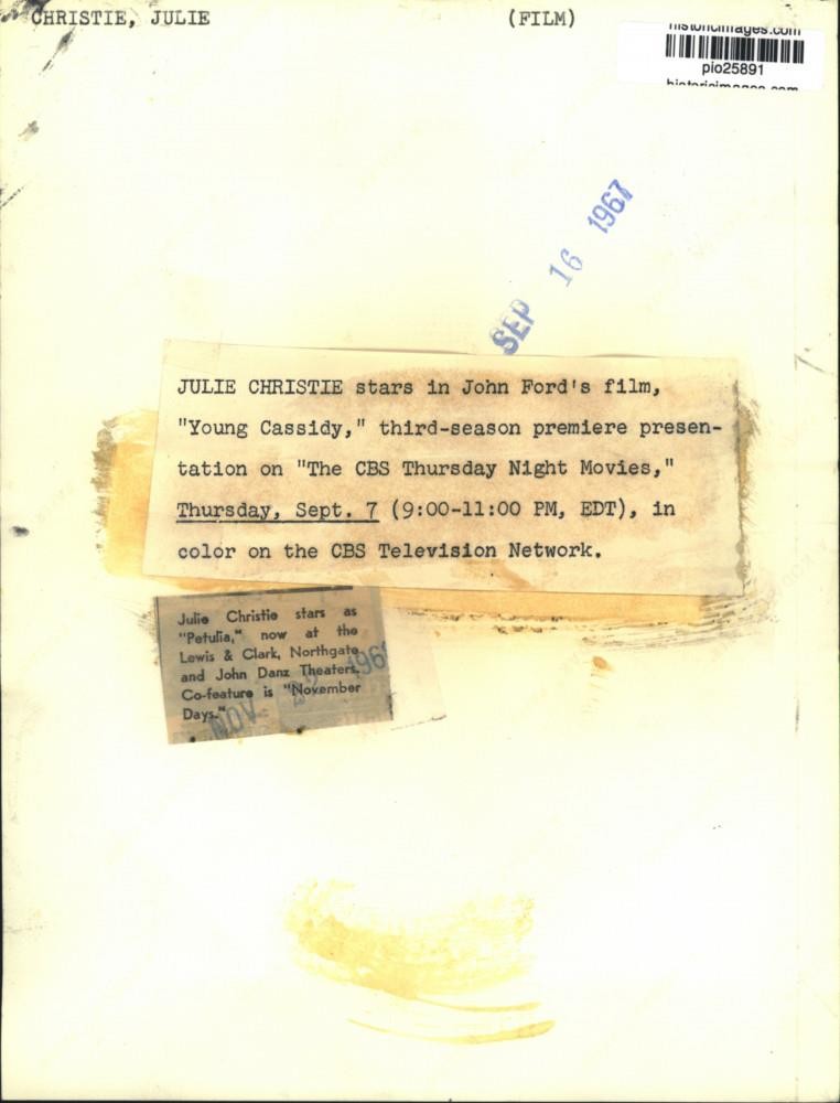 ebay template 1967 Press Photo Actress Julie Christie stars in "Young Cassidy" - pio25891 This is an original press photo. Christie, Julie (Films). Julie Christie stars in John Ford's film, "Young Cassidy", third-season premiere presentation on "The Columbia Broadcasting System Thursday Night Movies", Thursday, September 7 (9:00-11:00 PM, EDT), in