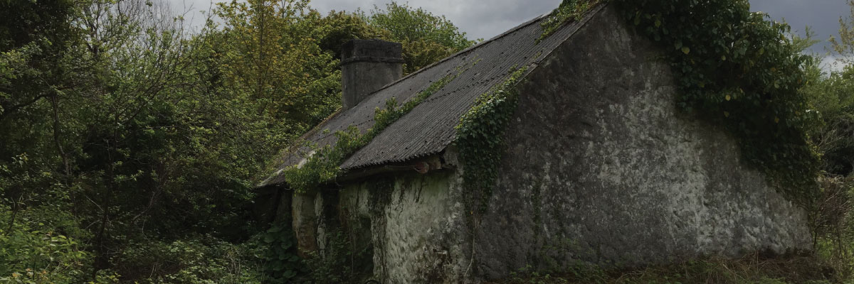 Old stone cottage with a thatched roof covered in moss and ivy.